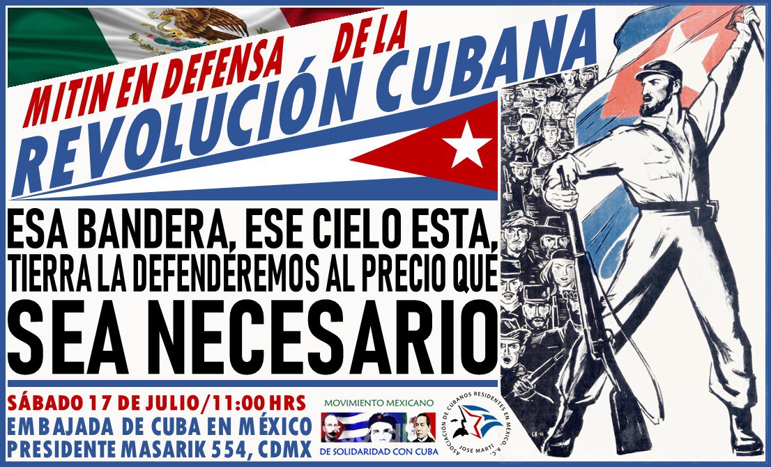 Convocamos a todas las organizaciones políticas, sociales y a todas las personas que queremos a esa Revolución, al mitin en defensa de Cuba el próximo sábado 17 de julio a las 11 horas, frente a la Embajada de Cuba en México (Presidente Masaryk 554, Polanco)